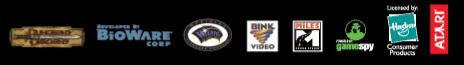 NEVERWINTER NIGHTS Game code © 2002-2003 Atari Interactive, Inc. All rights reserved. Macintosh version manufactured and marketed by Destineer, Inc. under license from Atari. Destineer is a trademark and MacSoft is a registered trademark of Destineer, Inc. All rights reserved. Portions ©2002 BioWare Corp. BioWare Aurora Engine copyright 1997-2002 BioWare Corp. All rights reserved. BioWare, the BioWare Aurora Engine, and the BioWare Logo are trademarks of BioWare Corp. All rights reserved. Neverwinter Nights, Forgotten Realms, The Forgotten Realms logo, Dungeons & Dragons logo, Dungeon Master, D&D, and the Wizards of the Coast logo are trademarks owned by Wizards of the Coast, Inc., a subsidiary of Hasbro, Inc. and are used by Atari under license. All rights reserved. HASBRO and its logo are trademarks of Hasbro and are used with permission. The ratings icon is a trademark of the Interactive Digital Software Association. All other trademarks are the property of their respective owners.